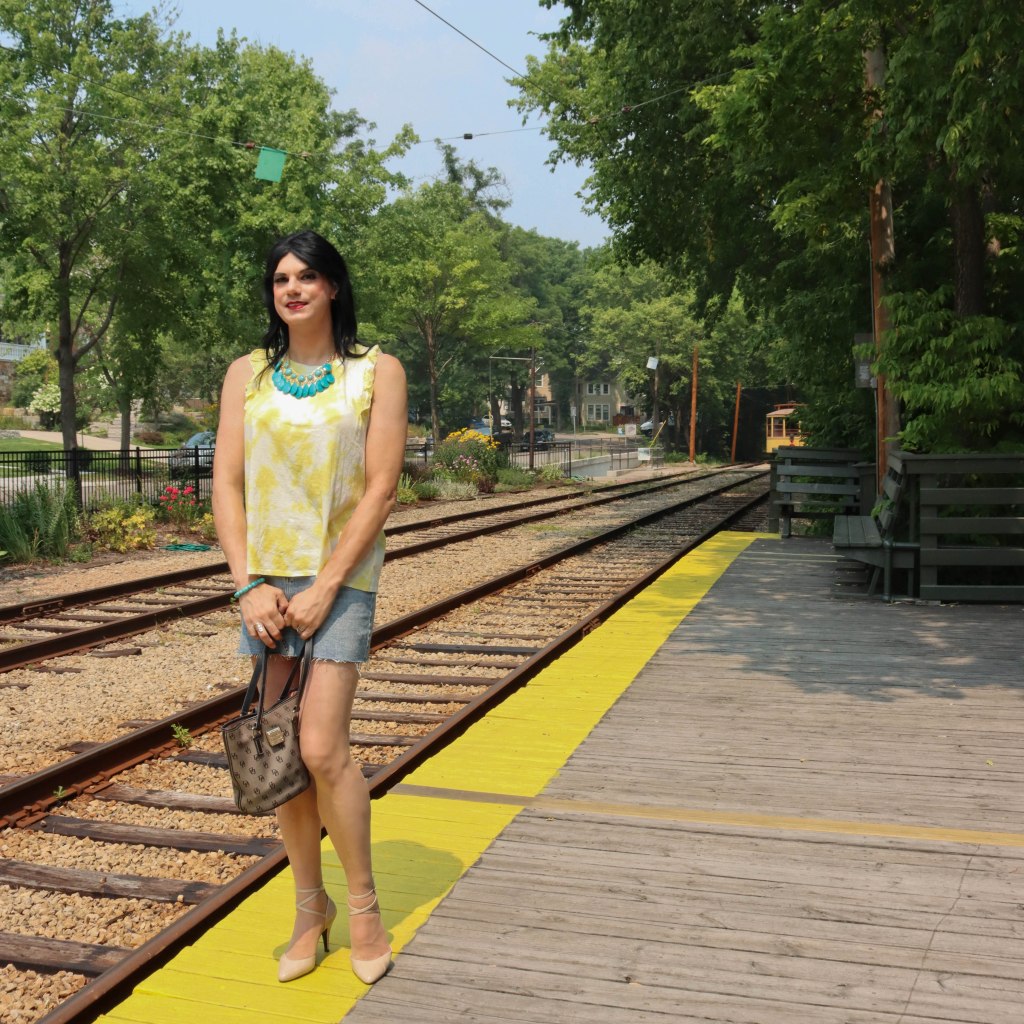 Out shopping one day I saw a cute top that I thought would look good with a jean skirt.  The top was dressy enough that matching the outfit with heels wouldn’t look out of place.  So I bought it, along with a jean skirt.  It was an outfit that I thought would look cute on any girl, even me.  I tried it on when I got home and my confidence crashed.  BUT!  I expected that.  Trying on an outfit in boy mode almost always makes me look terrible.  It is a completely different outfit when I am wearing my thigh pads, my breast forms, and have my hair and makeup done.  The outfit fit, it worked, and I decided to wear it one my next time out en femme.