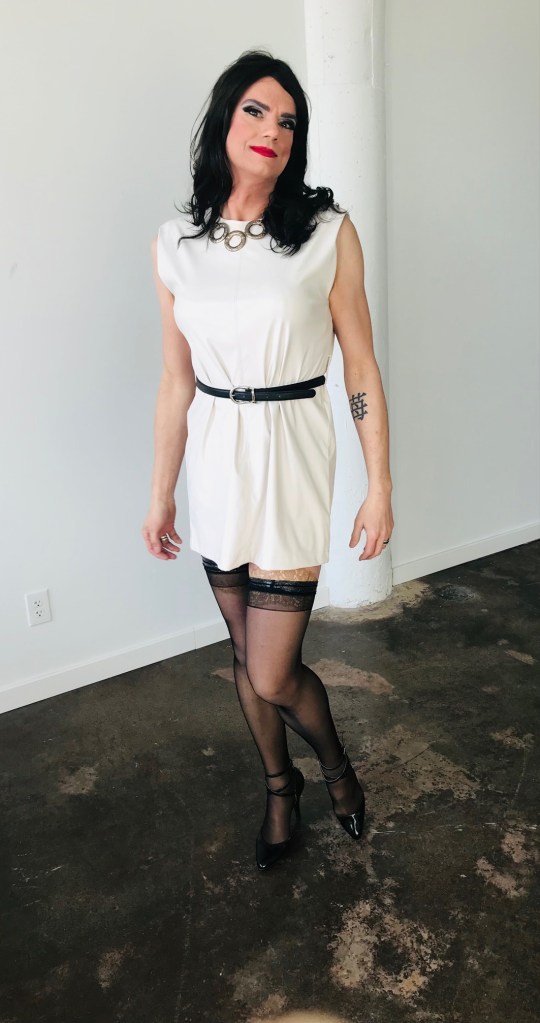 Most of what I wore for my last shoot, as I mentioned, was for En Femme. Two of their dresses stood out to me for different reasons. One had sleeves that were long enough for my arms. The other had a high neckline that was high enough to go over my Adam’s apple. I appreciated these considerations.