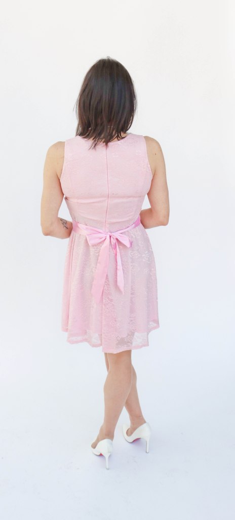 Exceptional photo shoot. The pink dress and white heels brighten up a summer day no matter what the weather. The belted bow and see thru hemline add flair to a great outfit. So delightfully pretty.