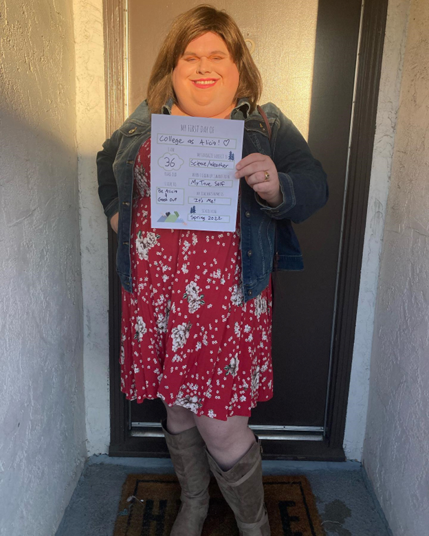 Then the pandemic happened, and like many of you, we were trapped at home. What’s crazy is that rather than pull us apart, the pandemic brought us closer together. We regularly checked in on each other, made sure to make space for some fun time at home, and with her encouragement, I made some time for Alicia. When everything started reopening, we were eager to get out, and much to my surprise, my wife communicated a willingness to actually go out with me presenting as Alicia. That date finally came in late June of 2020, and while I didn’t get out of the car (other than to fill up our car), it was a