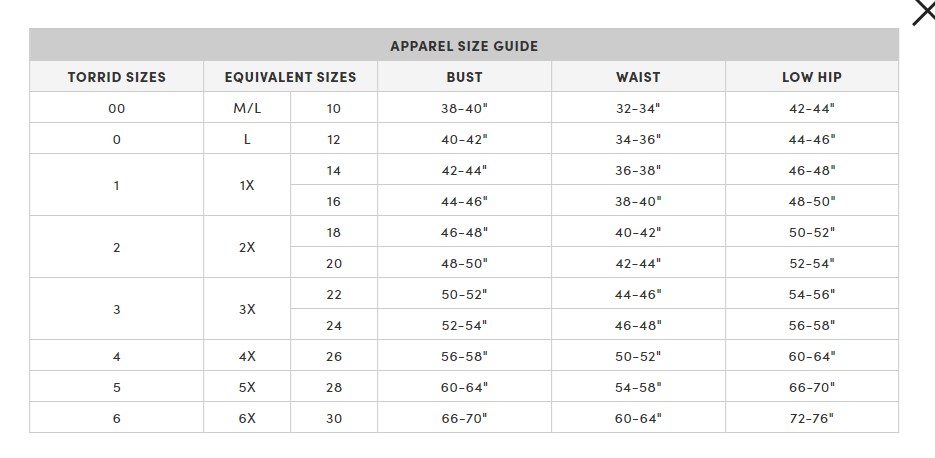 Torrid has a lot of cute clothes and they go up to size 30. Here’s their size chart: