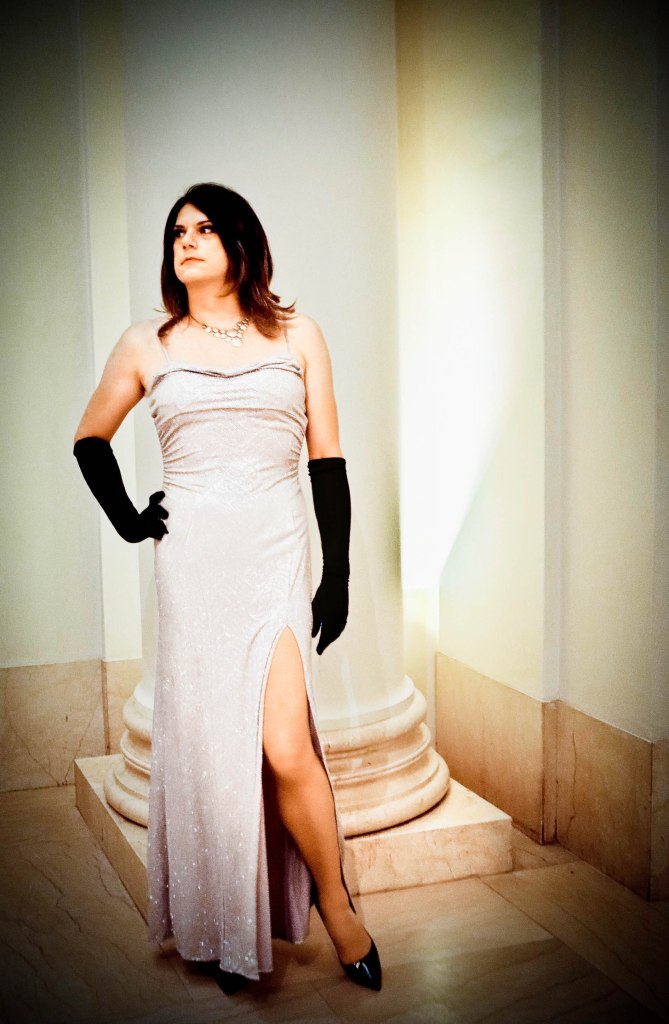 Best wishes on your business trip. The attached picture of you in that long gown with the leg split is remarkable as you wear it. Perhaps a side venture enfemme during your business trip would be a discovery in a new territory.