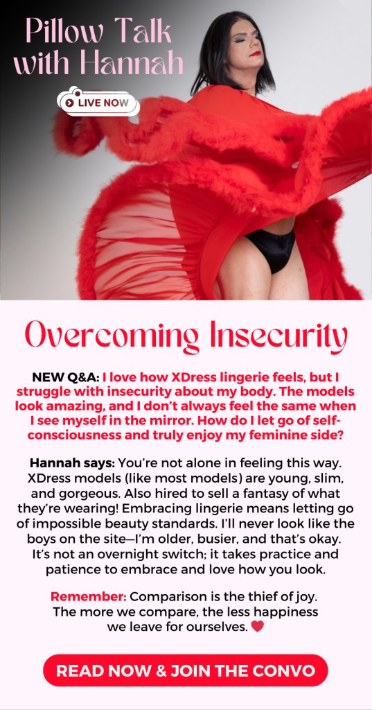 I love thought of not comparing yourself to others. Believe me, any time I look at one of my pics, I see all the flaws, all the blemishes, everything that I think makes me look not femme, old, overweight, whatever. Its sometimes easy to focus on the negative. Very simply, there will always be bad things to find, there will always be flaws. The hard part is to look past those and see what you like. See what makes you look good and see your own beauty.